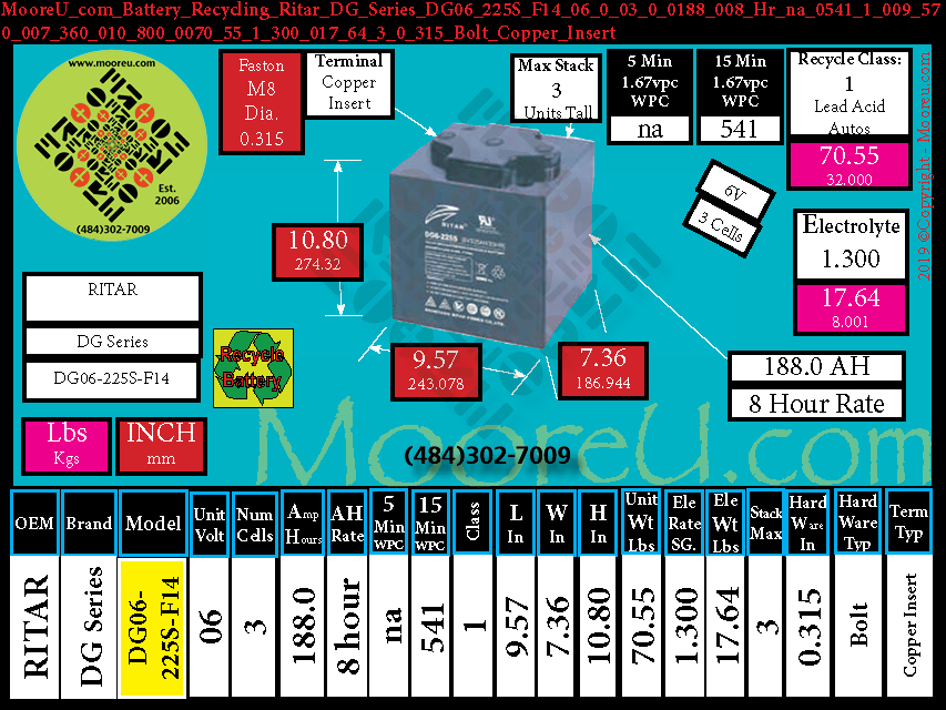 Battery Recycle Ritar DG Series DG06 225S V0 F16 T