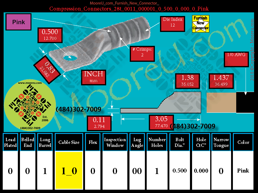 Each, Color: Pink, Lead Plate: No, Belled: No, Barrel: Long, Conductor: 1/0 AWG, Flex: No, Inspect Window: No, Angle: OO, Num Holes: 1, Bolt Size Dia: 1/2", C To C: 0, Tongue: Std, Tongue Wide: 0.83, Barrel L: 1.38, Thick: 0.11, Length: 3.05, mm x mm= n/a