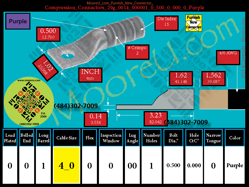 Each, Color: Purple, Lead Plate: No, Belled: No, Barrel: Long, Conductor: 4/0 AWG, Flex: No, Inspect Window: No, Angle: OO, Num Holes: 1, Bolt Size Dia: 1/2", C To C: 0, Tongue: Std, Tongue Wide: 1.02, Barrel L: 1.62, Thick: 0.14, Length: 3.23, mm x mm= n/a