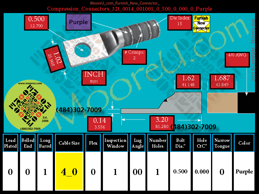 Each, Color: Purple, Lead Plate: No, Belled: No, Barrel: Long, Conductor: 4/0 AWG, Flex: No, Inspect Window: Yes, Angle: OO, Num Holes: 1, Bolt Size Dia: 1/2", C To C: 0, Tongue: Std, Tongue Wide: 1.02, Barrel L: 1.62, Thick: 0.14, Length: 3.20, mm x mm= n/a