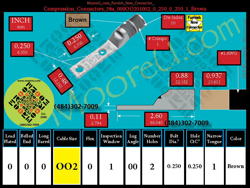 Each, Color: Brown, Lead Plate: No, Belled: No, Barrel: Std., Conductor: #2 AWG, Flex: No, Inspect Window: Yes, Angle: OO, Num Holes: 2, Bolt Size Dia: 1/4", C To C: 1/4", Tongue: Narrow, Tongue Wide: 0.48, Barrel L: 0.88, Thick: 0.11, Length: 2.60, mm x mm= 35