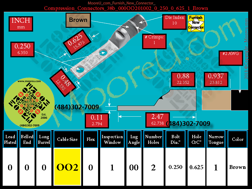 Each, Color: Brown, Lead Plate: No, Belled: No, Barrel: Std., Conductor: #2 AWG, Flex: No, Inspect Window: Yes, Angle: OO, Num Holes: 2, Bolt Size Dia: 1/4", C To C: 5/8", Tongue: Narrow, Tongue Wide: 0.48, Barrel L: 0.88, Thick: 0.11, Length: 2.47, mm x mm= 35
