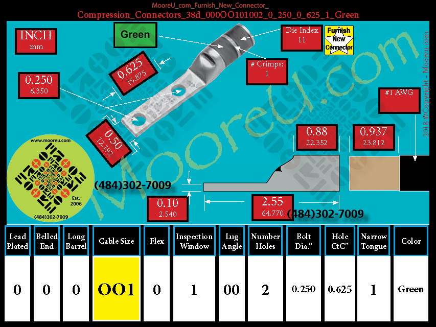 Each, Color: Green, Lead Plate: No, Belled: No, Barrel: Std., Conductor: #1 AWG, Flex: No, Inspect Window: Yes, Angle: OO, Num Holes: 2, Bolt Size Dia: 1/4", C To C: 5/8", Tongue: Narrow, Tongue Wide: 0.50, Barrel L: 0.88, Thick: 0.10, Length: 2.55, mm x mm= 50