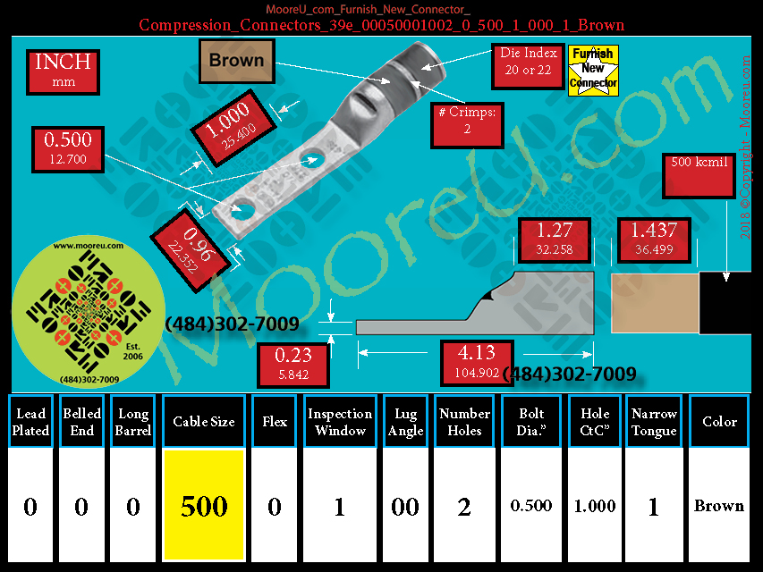 Each, Color: Brown, Lead Plate: No, Belled: No, Barrel: Std., Conductor: 500 kcmil, Flex: No, Inspect Window: Yes, Angle: OO, Num Holes: 2, Bolt Size Dia: 1/2", C To C: 1", Tongue: Narrow, Tongue Wide: 0.96, Barrel L: 1.27, Thick: 0.23, Length: 4.13, mm x mm= 240