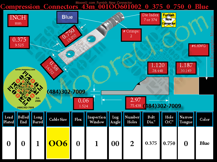 Each, Color: Blue, Lead Plate: No, Belled: No, Barrel: Long, Conductor: #6 AWG, Flex: No, Inspect Window: Yes, Angle: OO, Num Holes: 2, Bolt Size Dia: 3/8", C To C: 3/4", Tongue: Std, Tongue Wide: 0.58, Barrel L: 1.12, Thick: 0.06, Length: 2.97, mm x mm= n/a