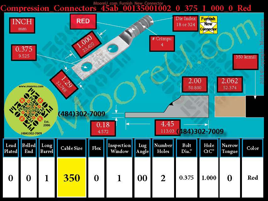 Each, Color: Red, Lead Plate: No, Belled: No, Barrel: Long, Conductor: 350 kcmil, Flex: No, Inspect Window: Yes, Angle: OO, Num Holes: 2, Bolt Size Dia: 3/8", C To C: 1", Tongue: Std, Tongue Wide: 1.29, Barrel L: 2.00, Thick: 0.18, Length: 4.45, mm x mm= 185