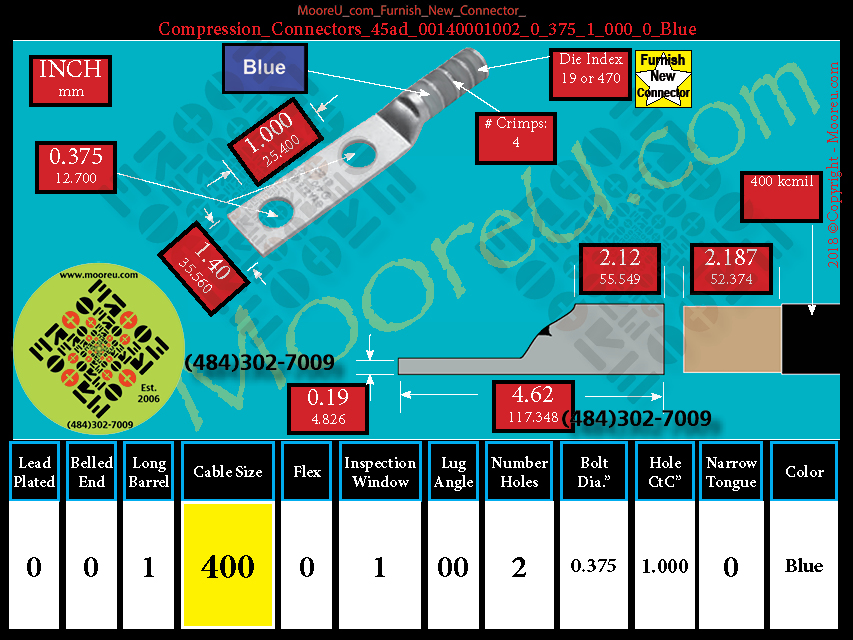 Each, Color: Blue, Lead Plate: No, Belled: No, Barrel: Long, Conductor: 400 kcmil, Flex: No, Inspect Window: Yes, Angle: OO, Num Holes: 2, Bolt Size Dia: 3/8", C To C: 1", Tongue: Std, Tongue Wide: 1.40, Barrel L: 2.12, Thick: 0.19, Length: 4.62, mm x mm= n/a