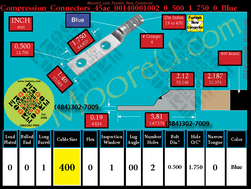 Each, Color: Blue, Lead Plate: No, Belled: No, Barrel: Long, Conductor: 400 kcmil, Flex: No, Inspect Window: Yes, Angle: OO, Num Holes: 2, Bolt Size Dia: 1/2", C To C: 1-3/4", Tongue: Std, Tongue Wide: 1.40, Barrel L: 2.12, Thick: 0.19, Length: 5.81, mm x mm= n/a