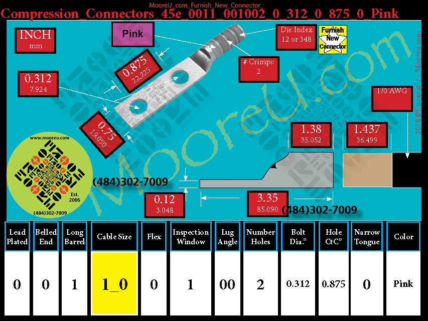 Each, Color: Pink, Lead Plate: No, Belled: No, Barrel: Long, Conductor: 1/0 AWG, Flex: No, Inspect Window: Yes, Angle: OO, Num Holes: 2, Bolt Size Dia: 5/16", C To C: 7/8", Tongue: Std, Tongue Wide: 0.75, Barrel L: 1.38, Thick: 0.12, Length: 3.35, mm x mm= n/a