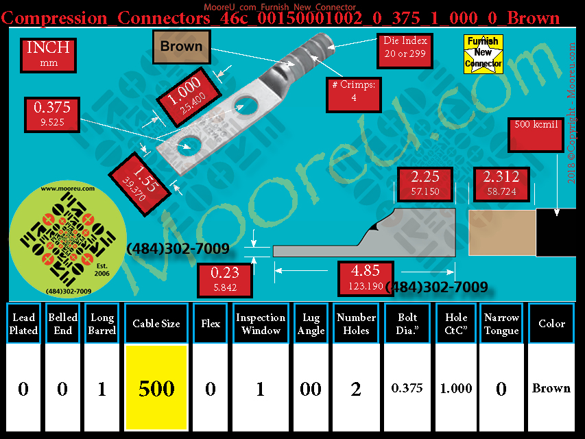 Each, Color: Brown, Lead Plate: No, Belled: No, Barrel: Long, Conductor: 500 kcmil, Flex: No, Inspect Window: Yes, Angle: OO, Num Holes: 2, Bolt Size Dia: 3/8", C To C: 1", Tongue: Std, Tongue Wide: 1.55, Barrel L: 2.25, Thick: 0.23, Length: 4.85, mm x mm= 240