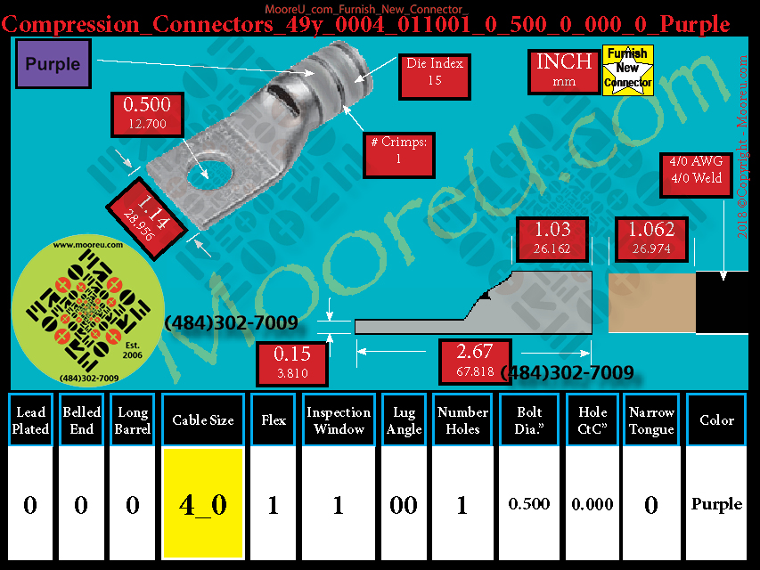 Each, Color: Purple, Lead Plate: No, Belled: No, Barrel: Std., Conductor: 550/24, 4/0 Weld, 4/0 AWG, Flex: Yes, Inspect Window: Yes, Angle: OO, Num Holes: 1, Bolt Size Dia: 1/2", C To C: 0, Tongue: Std, Tongue Wide: 1.14, Barrel L: 1.03, Thick: 0.15, Length: 2.67, mm x mm= 120
