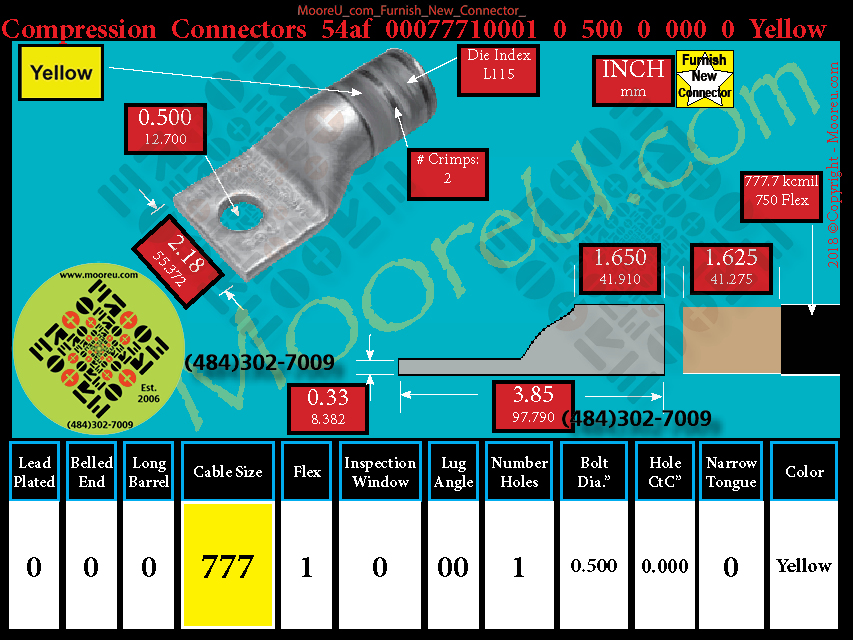 Each, Color: Yellow, Lead Plate: No, Belled: No, Barrel: Std., Conductor: 777.7 kcmil 1925/24 750 Flex, Flex: Yes, Inspect Window: No, Angle: OO, Num Holes: 1, Bolt Size Dia: 1/2", C To C: 0, Tongue: Std, Tongue Wide: 2.18, Barrel L: 1.65, Thick: 0.33, Length: 3.85, mm x mm= 500
