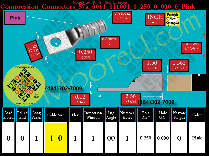 Each, Color: Pink, Lead Plate: No, Belled: No, Barrel: Long, Conductor: 275/24, 1/0 Weld 1/0 AWG, Flex: Yes, Inspect Window: Yes, Angle: OO, Num Holes: 1, Bolt Size Dia: 1/4", C To C: 0, Tongue: Std, Tongue Wide: 0.83, Barrel L: 1.50, Thick: 0.12, Length: 2.56, mm x mm= 50