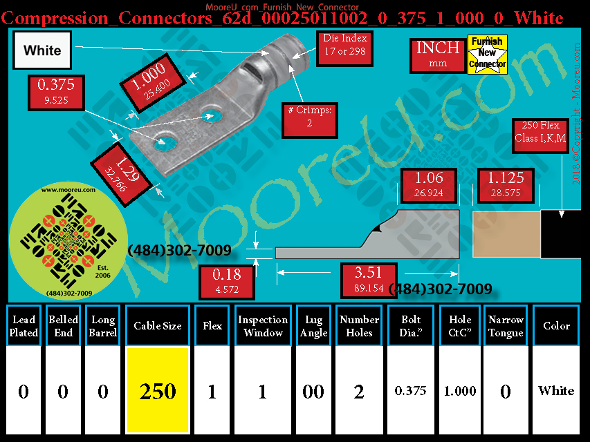 Each, Color: White, Lead Plate: No, Belled: No, Barrel: Std., Conductor: 250 Flex 637/24 CLASS I,K,M, Flex: Yes, Inspect Window: Yes, Angle: OO, Num Holes: 2, Bolt Size Dia: 3/8", C To C: 1", Tongue: Std, Tongue Wide: 1.29, Barrel L: 1.06, Thick: 0.18, Length: 3.51, mm x mm= 150