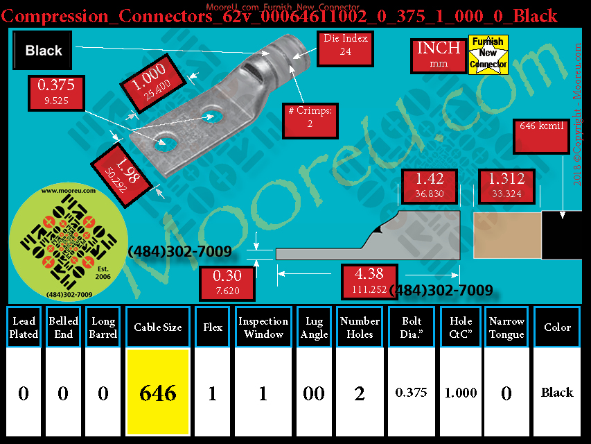 Each, Color: Black, Lead Plate: No, Belled: No, Barrel: Std., Conductor: 646 kcmil 1600/24, Flex: Yes, Inspect Window: Yes, Angle: OO, Num Holes: 2, Bolt Size Dia: 3/8", C To C: 1", Tongue: Std, Tongue Wide: 1.98, Barrel L: 1.42, Thick: 0.30, Length: 4.38, mm x mm= 400