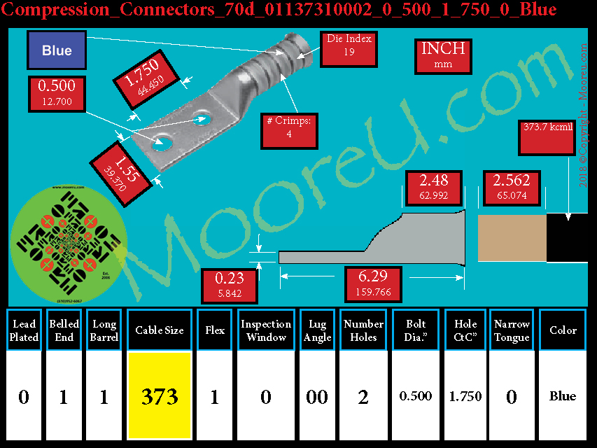 Each, Color: Blue, Lead Plate: No, Belled: Yes, Barrel: Long, Conductor: 925/24 373.7 kcmil (350 kcmil nom.), Flex: Yes, Inspect Window: No, Angle: OO, Num Holes: 2, Bolt Size Dia: 1/2", C To C: 1-3/4", Tongue: Std, Tongue Wide: 1.55, Barrel L: 2.48, Thick: 0.23, Length: 6.29, mm x mm= 240
