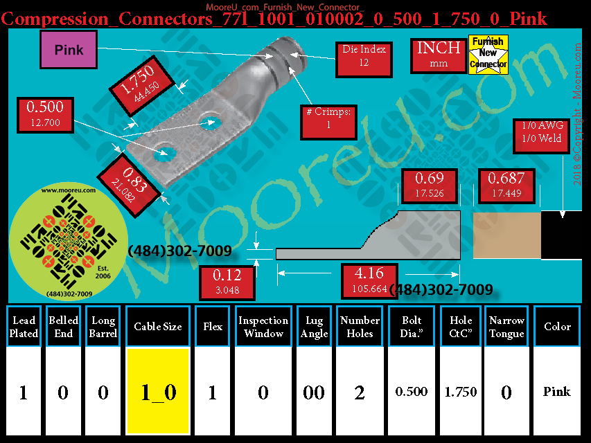 Each, Color: Pink, Lead Plate: Yes, Belled: No, Barrel: Std., Conductor: 1/0 Weld 275/24 1/0 AWG, Flex: Yes, Inspect Window: No, Angle: OO, Num Holes: 2, Bolt Size Dia: 1/2", C To C: 1-3/4", Tongue: Std, Tongue Wide: 0.83, Barrel L: 0.69, Thick: 0.12, Length: 4.16, mm x mm= 50