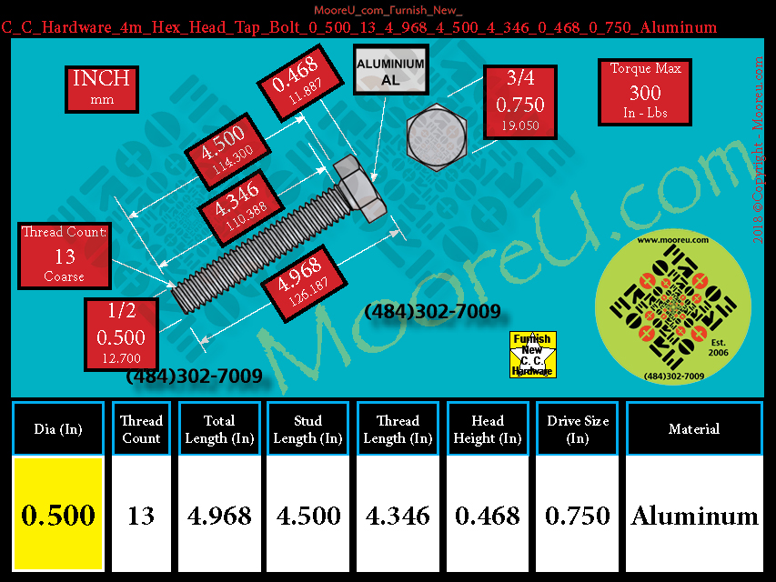 Copper Conn Hardware, Each, Component = Hex_Head_Tap_Bolt, Material = Aluminum, Dia = 1/2", Thread Count = 13, Total Length = 4.968, Stud Length = 4-1/2", Thread Length = 4.34615384615385, Torque = 300 Inch Lbs, Thread Length = 4-5/16", Height = 15/32", Width = 3/4"
