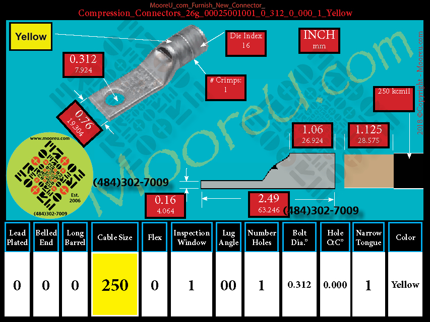 Each, Color: Yellow, Lead Plate: No, Belled: No, Barrel: Std., Conductor: 250 kcmil, Flex: No, Inspect Window: Yes, Angle: OO, Num Holes: 1, Bolt Size Dia: 5/16", C To C: 0, Tongue: Narrow, Tongue Wide: 0.76, Barrel L: 1.06, Thick: 0.16, Length: 2.49, mm x mm= n/a