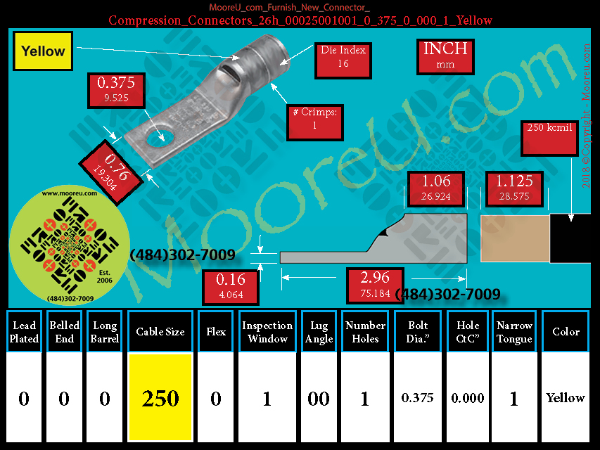 Each, Color: Yellow, Lead Plate: No, Belled: No, Barrel: Std., Conductor: 250 kcmil, Flex: No, Inspect Window: Yes, Angle: OO, Num Holes: 1, Bolt Size Dia: 3/8", C To C: 0, Tongue: Narrow, Tongue Wide: 0.76, Barrel L: 1.06, Thick: 0.16, Length: 2.96, mm x mm= n/a