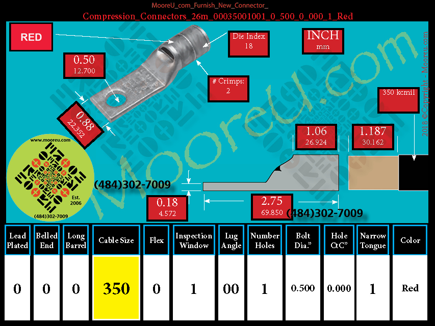 Each, Color: Red, Lead Plate: No, Belled: No, Barrel: Std., Conductor: 350 kcmil, Flex: No, Inspect Window: Yes, Angle: OO, Num Holes: 1, Bolt Size Dia: 1/2", C To C: 0, Tongue: Narrow, Tongue Wide: 0.88, Barrel L: 1.06, Thick: 0.18, Length: 2.75, mm x mm= 185