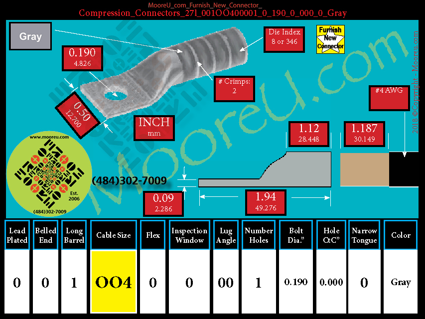 Each, Color: Gray, Lead Plate: No, Belled: No, Barrel: Long, Conductor: #4 AWG, Flex: No, Inspect Window: No, Angle: OO, Num Holes: 1, Bolt Size Dia: #10, C To C: 0, Tongue: Std, Tongue Wide: 0.50, Barrel L: 1.12, Thick: 0.09, Length: 1.94, mm x mm= n/a