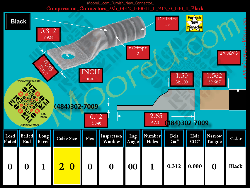 Each, Color: Black, Lead Plate: No, Belled: No, Barrel: Long, Conductor: 2/0 AWG, Flex: No, Inspect Window: No, Angle: OO, Num Holes: 1, Bolt Size Dia: 5/16", C To C: 0, Tongue: Std, Tongue Wide: 0.83, Barrel L: 1.5, Thick: 0.12, Length: 2.65, mm x mm= 70