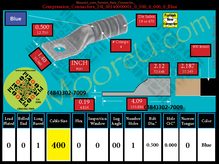 Each, Color: Blue, Lead Plate: No, Belled: No, Barrel: Long, Conductor: 400 kcmil, Flex: No, Inspect Window: No, Angle: OO, Num Holes: 1, Bolt Size Dia: 1/2", C To C: 0, Tongue: Std, Tongue Wide: 1.40, Barrel L: 2.12, Thick: 0.19, Length: 4.09, mm x mm= n/a