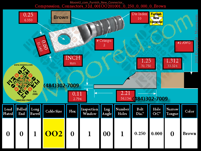 Each, Color: Brown, Lead Plate: No, Belled: No, Barrel: Long, Conductor: #2 AWG, Flex: No, Inspect Window: Yes, Angle: OO, Num Holes: 1, Bolt Size Dia: 1/4", C To C: 0, Tongue: Std, Tongue Wide: 0.60, Barrel L: 1.25, Thick: 0.11, Length: 2.21, mm x mm= 35