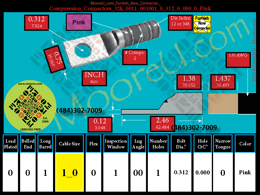 Each, Color: Pink, Lead Plate: No, Belled: No, Barrel: Long, Conductor: 1/0 AWG, Flex: No, Inspect Window: Yes, Angle: OO, Num Holes: 1, Bolt Size Dia: 5/16", C To C: 0, Tongue: Std, Tongue Wide: 0.75, Barrel L: 1.38, Thick: 0.12, Length: 2.46, mm x mm= n/a