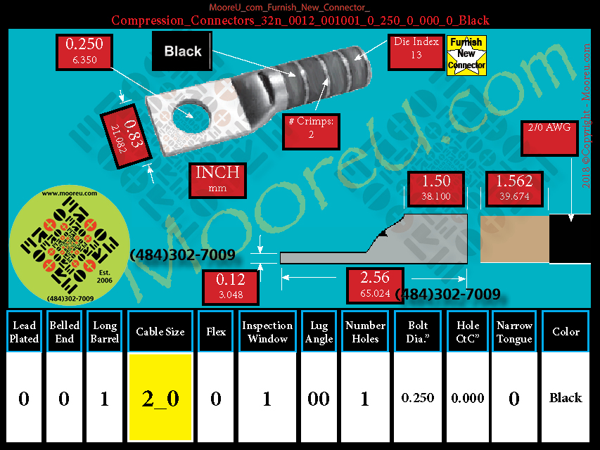 Each, Color: Black, Lead Plate: No, Belled: No, Barrel: Long, Conductor: 2/0 AWG, Flex: No, Inspect Window: Yes, Angle: OO, Num Holes: 1, Bolt Size Dia: 1/4", C To C: 0, Tongue: Std, Tongue Wide: 0.83, Barrel L: 1.50, Thick: 0.12, Length: 2.56, mm x mm= 70