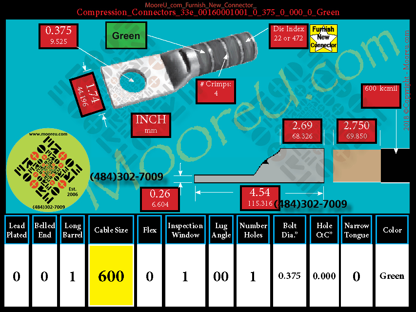 Each, Color: Green, Lead Plate: No, Belled: No, Barrel: Long, Conductor: 600 kcmil, Flex: No, Inspect Window: Yes, Angle: OO, Num Holes: 1, Bolt Size Dia: 3/8", C To C: 0, Tongue: Std, Tongue Wide: 1.74, Barrel L: 2.69, Thick: 0.26, Length: 4.54, mm x mm= 300