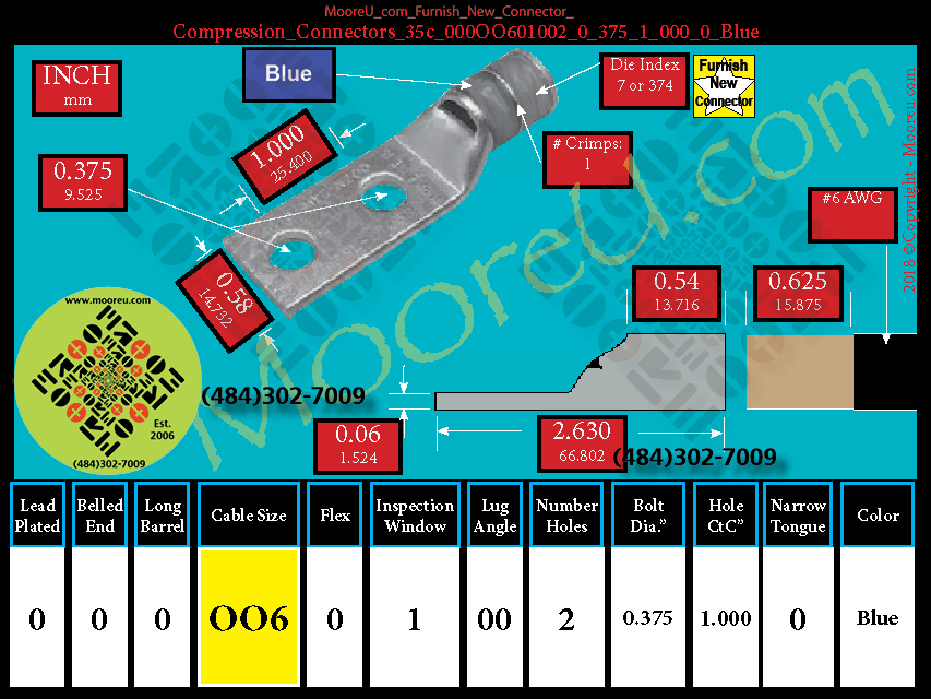 Each, Color: Blue, Lead Plate: No, Belled: No, Barrel: Std., Conductor: #6 AWG, Flex: No, Inspect Window: Yes, Angle: OO, Num Holes: 2, Bolt Size Dia: 3/8", C To C: 1", Tongue: Std, Tongue Wide: 0.58, Barrel L: 0.54, Thick: 0.06, Length: 2.63, mm x mm= n/a