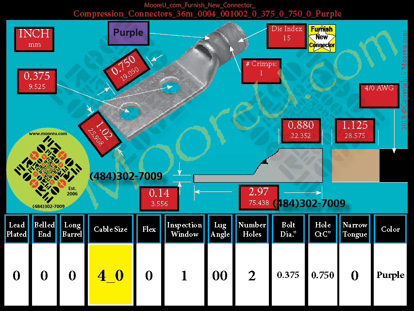 Each, Color: Purple, Lead Plate: No, Belled: No, Barrel: Std., Conductor: 4/0 AWG, Flex: No, Inspect Window: Yes, Angle: OO, Num Holes: 2, Bolt Size Dia: 3/8", C To C: 3/4", Tongue: Std, Tongue Wide: 1.02, Barrel L: 0.88, Thick: 0.14, Length: 2.97, mm x mm= n/a