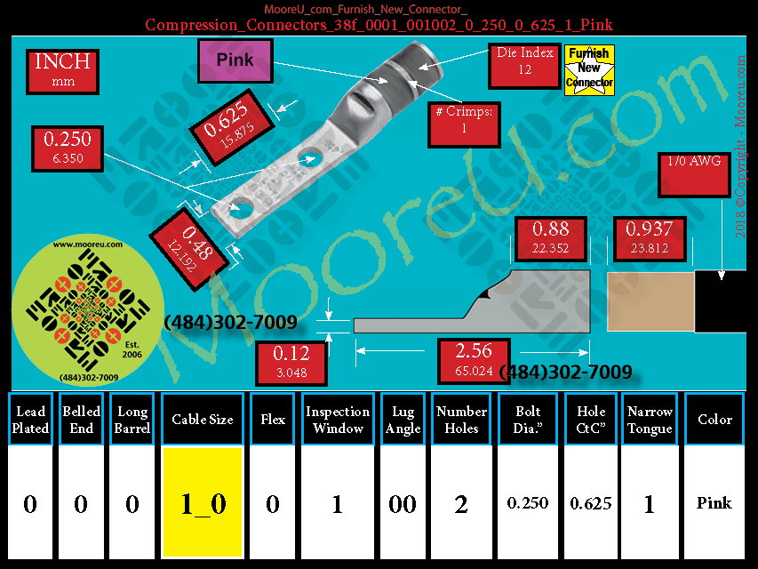 Each, Color: Pink, Lead Plate: No, Belled: No, Barrel: Std., Conductor: 1/0 AWG, Flex: No, Inspect Window: Yes, Angle: OO, Num Holes: 2, Bolt Size Dia: 1/4", C To C: 5/8", Tongue: Narrow, Tongue Wide: 0.48, Barrel L: 0.88, Thick: 0.12, Length: 2.56, mm x mm= n/a