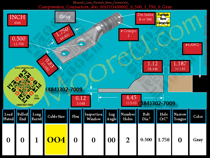 Each, Color: Gray, Lead Plate: No, Belled: No, Barrel: Long, Conductor: #4 AWG, Flex: No, Inspect Window: No, Angle: OO, Num Holes: 2, Bolt Size Dia: 1/2", C To C: 1-3/4", Tongue: Std, Tongue Wide: 0.83, Barrel L: 1.12, Thick: 0.12, Length: 4.45, mm x mm= n/a