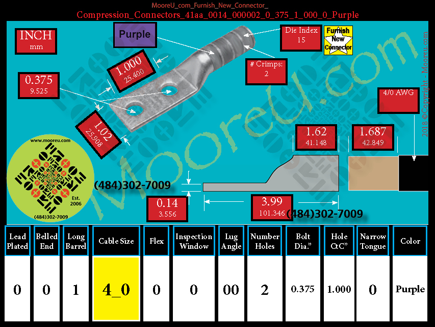 Each, Color: Purple, Lead Plate: No, Belled: No, Barrel: Long, Conductor: 4/0 AWG, Flex: No, Inspect Window: No, Angle: OO, Num Holes: 2, Bolt Size Dia: 3/8", C To C: 1", Tongue: Std, Tongue Wide: 1.02, Barrel L: 1.62, Thick: 0.14, Length: 3.99, mm x mm= n/a