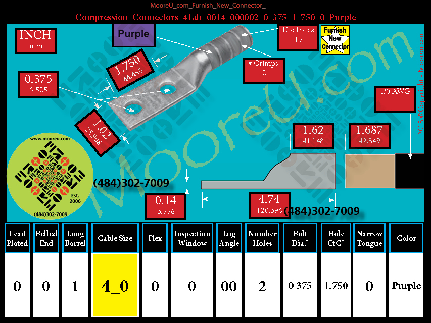 Each, Color: Purple, Lead Plate: No, Belled: No, Barrel: Long, Conductor: 4/0 AWG, Flex: No, Inspect Window: No, Angle: OO, Num Holes: 2, Bolt Size Dia: 3/8", C To C: 1-3/4", Tongue: Std, Tongue Wide: 1.02, Barrel L: 1.62, Thick: 0.14, Length: 4.74, mm x mm= n/a