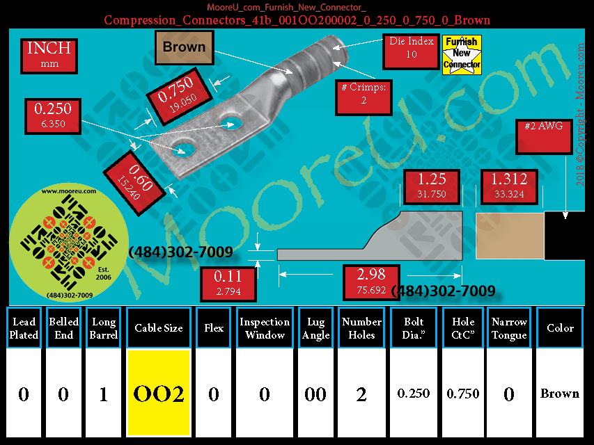 Each, Color: Brown, Lead Plate: No, Belled: No, Barrel: Long, Conductor: #2 AWG, Flex: No, Inspect Window: No, Angle: OO, Num Holes: 2, Bolt Size Dia: 1/4", C To C: 3/4", Tongue: Std, Tongue Wide: 0.60, Barrel L: 1.25, Thick: 0.11, Length: 2.98, mm x mm= 35
