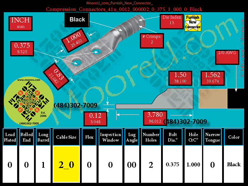 Each, Color: Black, Lead Plate: No, Belled: No, Barrel: Long, Conductor: 2/0 AWG, Flex: No, Inspect Window: No, Angle: OO, Num Holes: 2, Bolt Size Dia: 3/8", C To C: 1", Tongue: Std, Tongue Wide: 0.83, Barrel L: 1.50, Thick: 0.12, Length: 3.78, mm x mm= 70