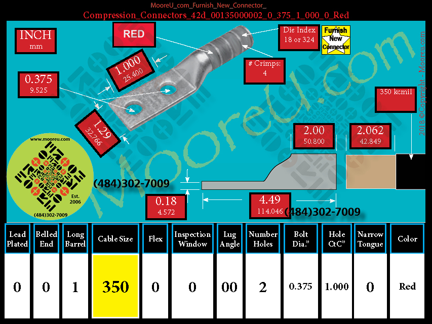 Each, Color: Red, Lead Plate: No, Belled: No, Barrel: Long, Conductor: 350 kcmil, Flex: No, Inspect Window: No, Angle: OO, Num Holes: 2, Bolt Size Dia: 3/8", C To C: 1", Tongue: Std, Tongue Wide: 1.29, Barrel L: 2.00, Thick: 0.18, Length: 4.49, mm x mm= 185