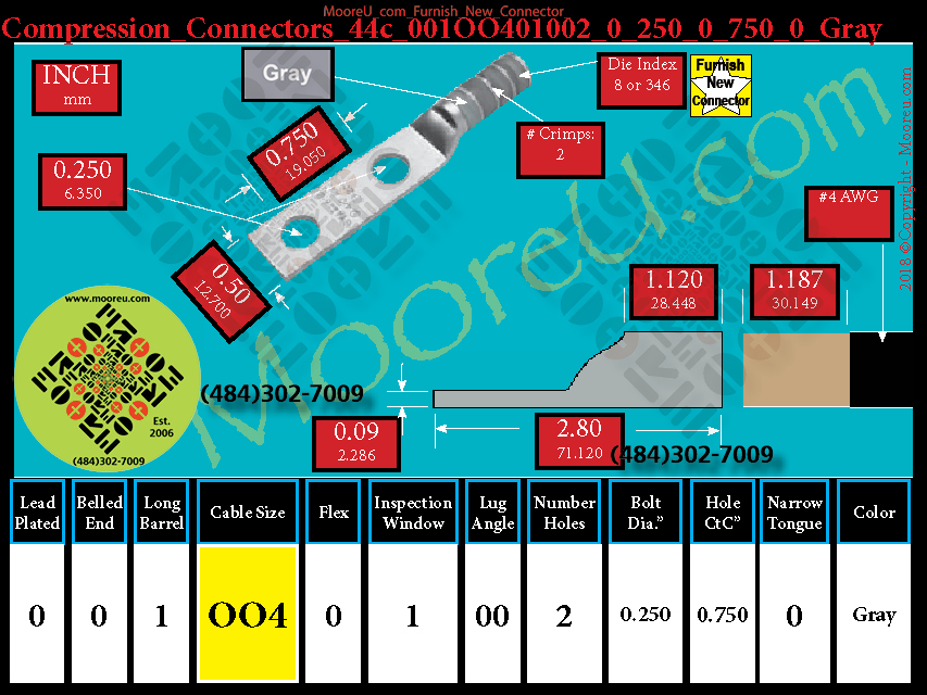 Each, Color: Gray, Lead Plate: No, Belled: No, Barrel: Long, Conductor: #4 AWG, Flex: No, Inspect Window: Yes, Angle: OO, Num Holes: 2, Bolt Size Dia: 1/4", C To C: 3/4", Tongue: Std, Tongue Wide: 0.50, Barrel L: 1.12, Thick: 0.09, Length: 2.80, mm x mm= n/a