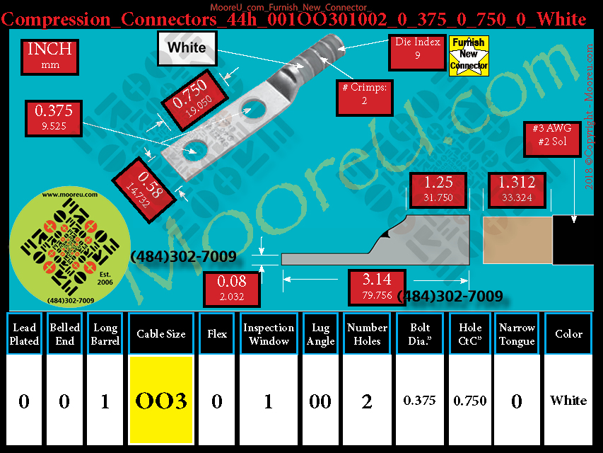 Each, Color: White, Lead Plate: No, Belled: No, Barrel: Long, Conductor: #3 AWG, #2 Sol, Flex: No, Inspect Window: Yes, Angle: OO, Num Holes: 2, Bolt Size Dia: 3/8", C To C: 3/4", Tongue: Std, Tongue Wide: 0.58, Barrel L: 1.25, Thick: 0.08, Length: 3.14, mm x mm= 25