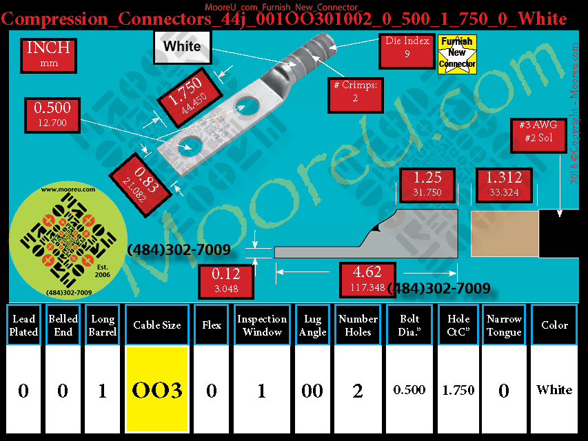 Each, Color: White, Lead Plate: No, Belled: No, Barrel: Long, Conductor: #3 AWG, #2 Sol, Flex: No, Inspect Window: Yes, Angle: OO, Num Holes: 2, Bolt Size Dia: 1/2", C To C: 1-3/4", Tongue: Std, Tongue Wide: 0.83, Barrel L: 1.25, Thick: 0.12, Length: 4.62, mm x mm= 25
