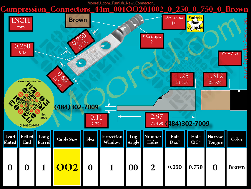 Each, Color: Brown, Lead Plate: No, Belled: No, Barrel: Long, Conductor: #2 AWG, Flex: No, Inspect Window: Yes, Angle: OO, Num Holes: 2, Bolt Size Dia: 1/4", C To C: 3/4", Tongue: Std, Tongue Wide: 0.60, Barrel L: 1.25, Thick: 0.11, Length: 2.97, mm x mm= 35