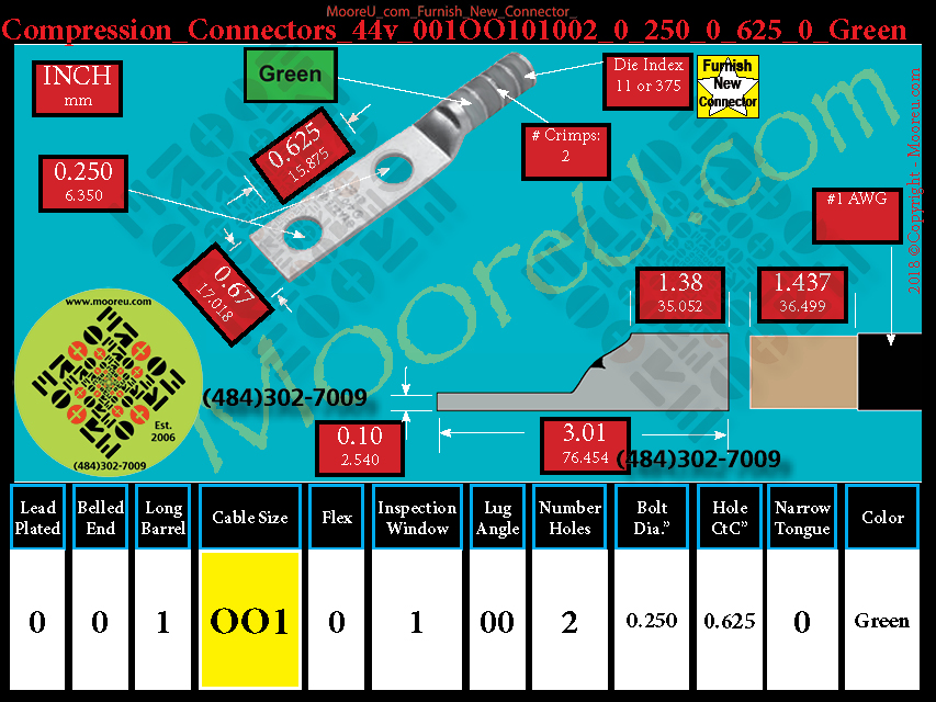Each, Color: Green, Lead Plate: No, Belled: No, Barrel: Long, Conductor: #1 AWG, Flex: No, Inspect Window: Yes, Angle: OO, Num Holes: 2, Bolt Size Dia: 1/4", C To C: 5/8", Tongue: Std, Tongue Wide: 0.67, Barrel L: 1.38, Thick: 0.10, Length: 3.01, mm x mm= 50