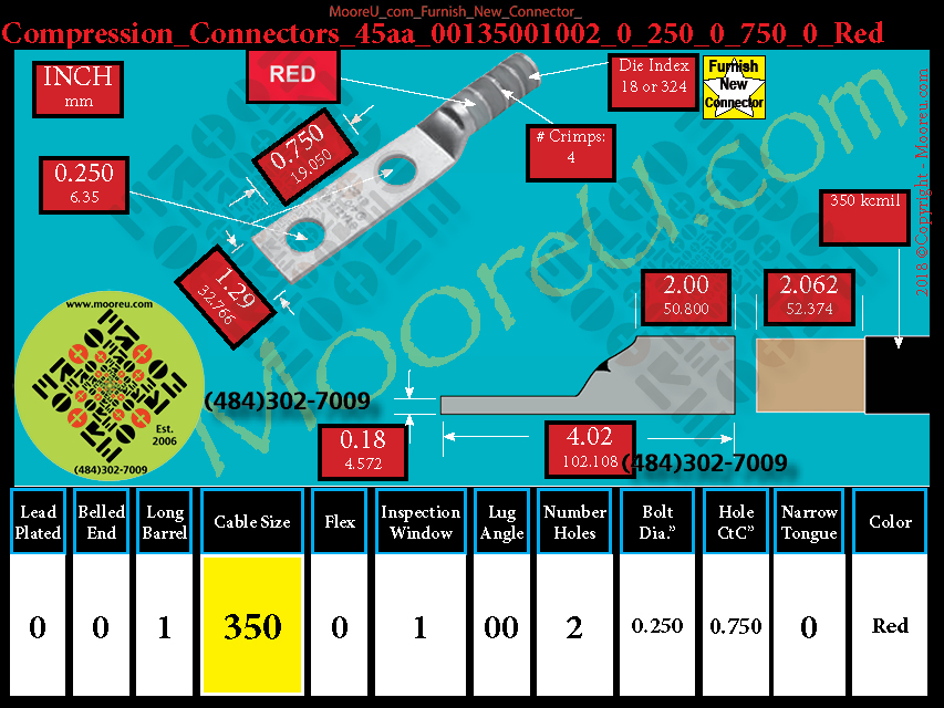 Each, Color: Red, Lead Plate: No, Belled: No, Barrel: Long, Conductor: 350 kcmil, Flex: No, Inspect Window: Yes, Angle: OO, Num Holes: 2, Bolt Size Dia: 1/4", C To C: 3/4", Tongue: Std, Tongue Wide: 1.29, Barrel L: 2.00, Thick: 0.18, Length: 4.02, mm x mm= 185