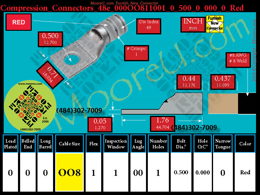 Each, Color: Red, Lead Plate: No, Belled: No, Barrel: Std., Conductor: #8 Weld 37/24, #8 AWG, #6 Sol., #8 Sol., Flex: Yes, Inspect Window: Yes, Angle: OO, Num Holes: 1, Bolt Size Dia: 1/2", C To C: 0, Tongue: Std, Tongue Wide: 0.71, Barrel L: 0.44, Thick: 0.05, Length: 1.76, mm x mm= 10