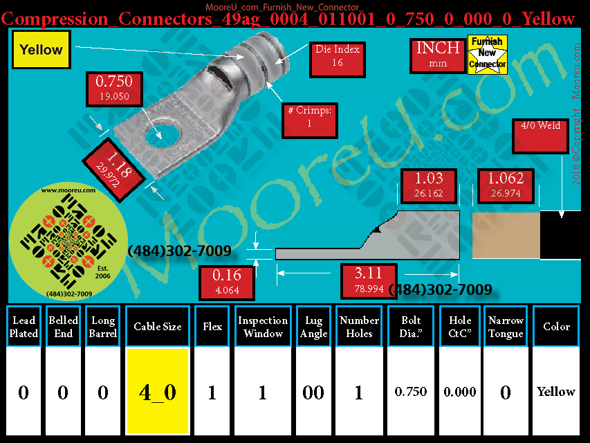 Each, Color: Yellow, Lead Plate: No, Belled: No, Barrel: Std., Conductor: 550/24, 4/0 Weld, Flex: Yes, Inspect Window: Yes, Angle: OO, Num Holes: 1, Bolt Size Dia: 3/4", C To C: 0, Tongue: Std, Tongue Wide: 1.18, Barrel L: 1.03, Thick: 0.16, Length: 3.11, mm x mm= n/a