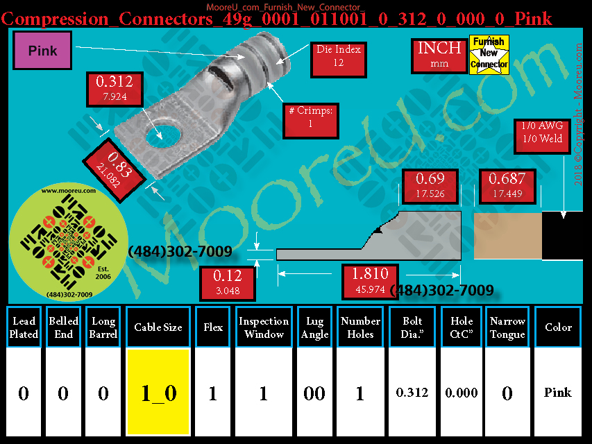 Each, Color: Pink, Lead Plate: No, Belled: No, Barrel: Std., Conductor: 275/24, 1/0 Weld, 1/0 AWG, Flex: Yes, Inspect Window: Yes, Angle: OO, Num Holes: 1, Bolt Size Dia: 5/16", C To C: 0, Tongue: Std, Tongue Wide: 0.83, Barrel L: 0.69, Thick: 0.12, Length: 1.81, mm x mm= 50